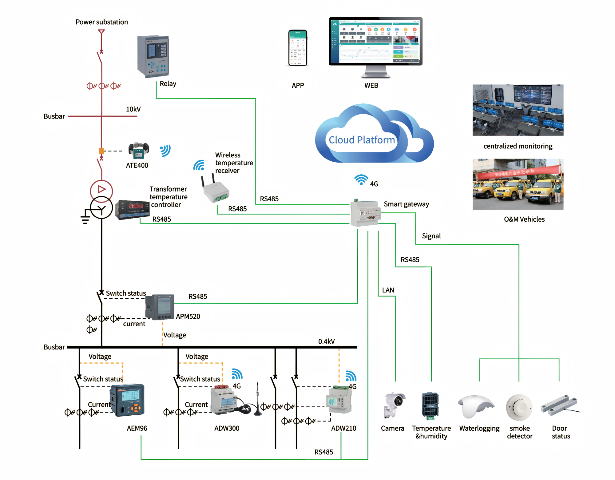 La solución de subestación y sala de distribución de Acrel proporciona una infraestructura digital integral y cibersegura para sistemas de energía. La solución incluye relés de protección, analizadores de calidad de energía y relés de protección contra arco eléctrico para proteger los equipos de energía críticos. Los sensores inalámbricos de temperatura de barras colectoras y los productos de descarga parcial permiten un monitoreo continuo del estado del tablero.