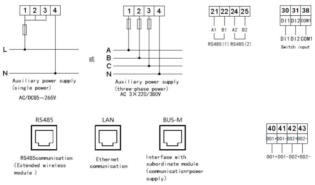 | energía auxiliar | voltaje | Fuente de alimentación trifásica 3*220V/380V (para fuente de alimentación monofásica, terminales de cortocircuito 1, 2 y 3 en el instrumento) |