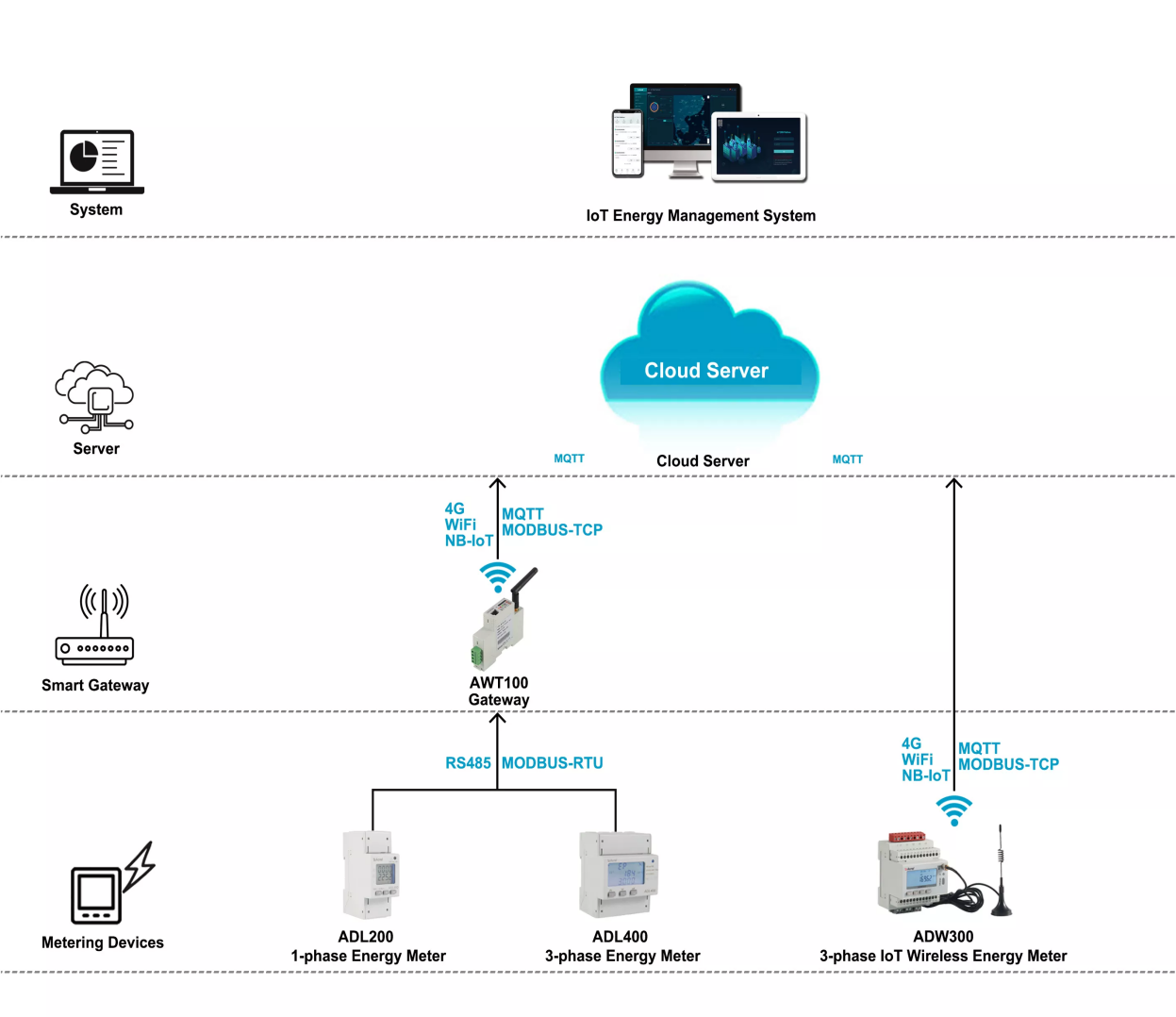 | ADW300 | El medidor inalámbrico ADW300 se utiliza principalmente para medir la potencia activa trifásica de una red de bajo voltaje. Tiene comunicación RS485 y funciones de comunicación inalámbrica WiFi/4G/Ethernet/LoRa, lo cual es conveniente para que los usuarios monitoreen, lean y administren el consumo de electricidad. Se puede instalar de manera flexible en la caja de distribución para lograr mediciones, estadísticas y análisis de potencia de subelementos de diferentes áreas y diferentes cargas. | |