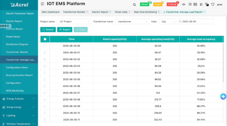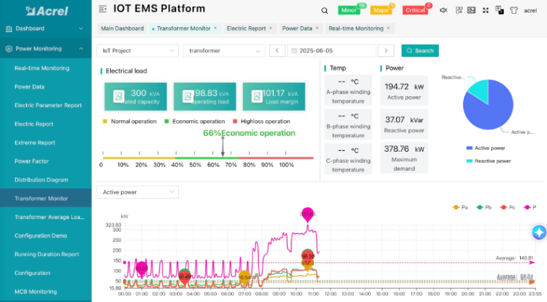 2. Visualización del funcionamiento del transformador: La plataforma monitorea continuamente parámetros críticos (corriente, voltaje, factor de potencia, etc.), asegurando que los transformadores funcionen dentro de límites de carga seguros y reduciendo el riesgo de sobrecarga y daños.
